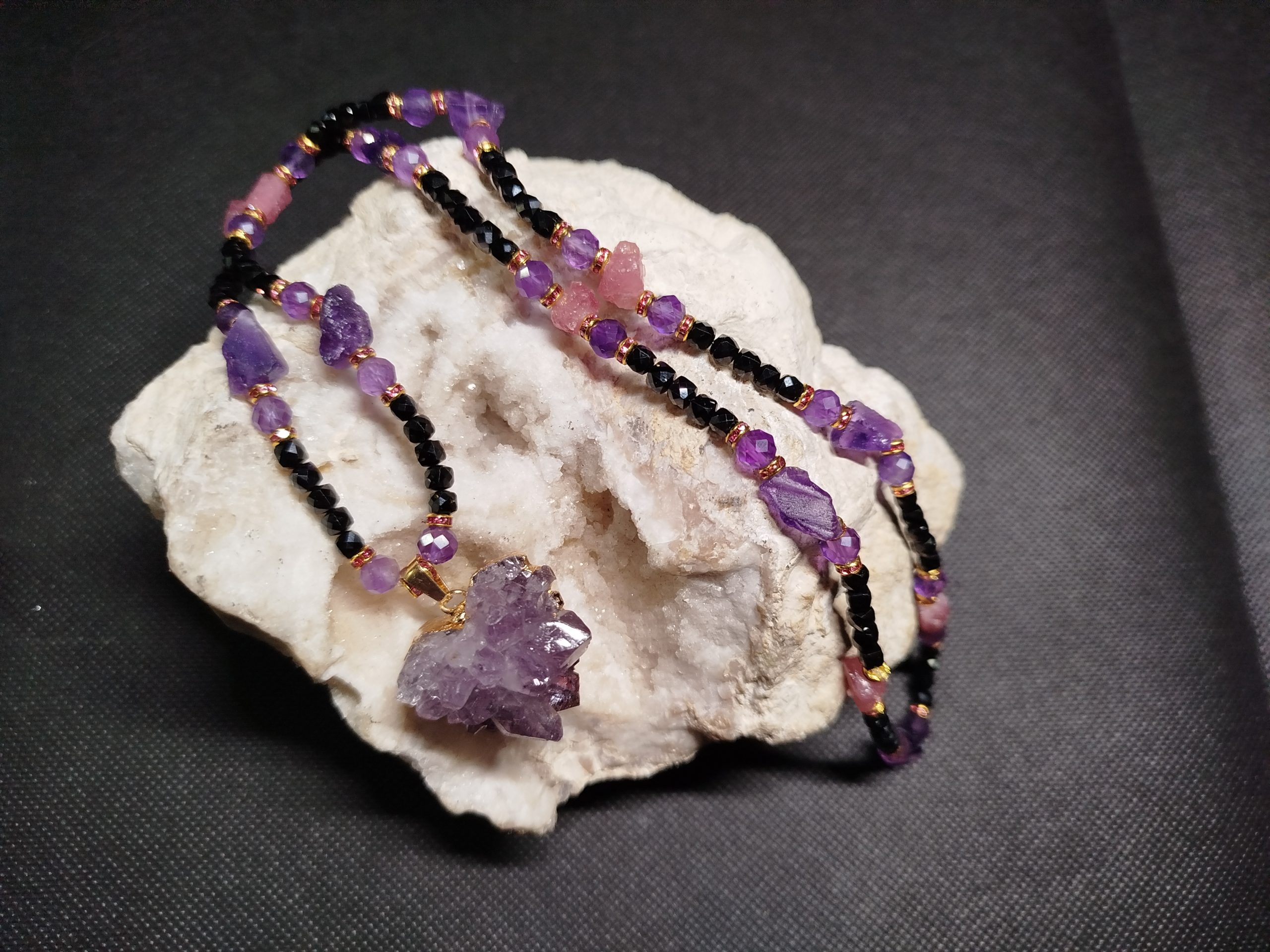 Collier Améthyste, Quartz rose et Spinelle