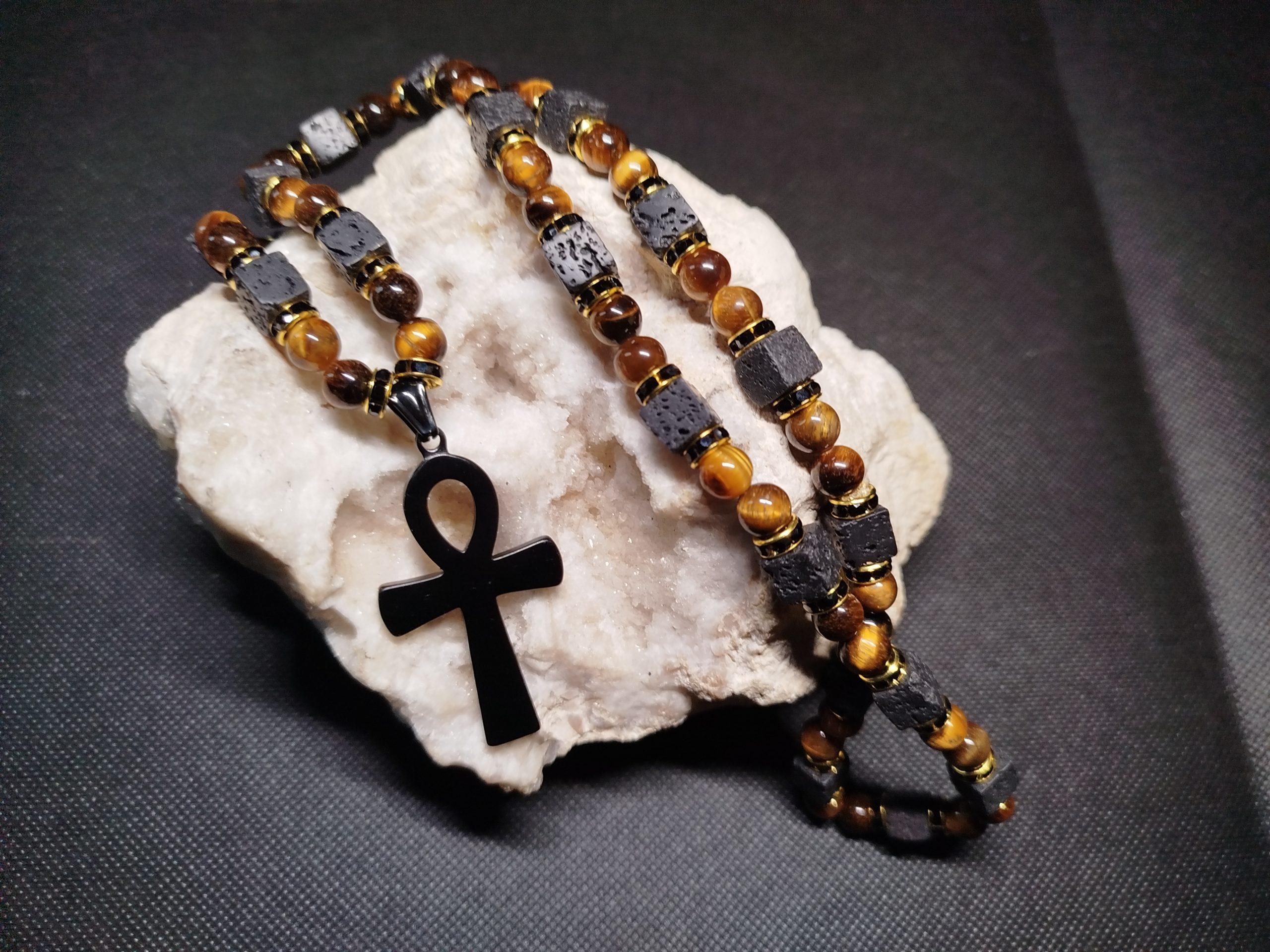 Collier Oeil de tigre et Pierre de lave croix d’Ankh
